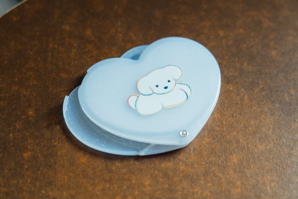 イラストレーター・てらおかなつみさんの、ハート型コンパクトミラー。ラメ入りの表面に心が躍ります。手のひらサイズで持ち歩きやすく、スタンドとしても使えます。