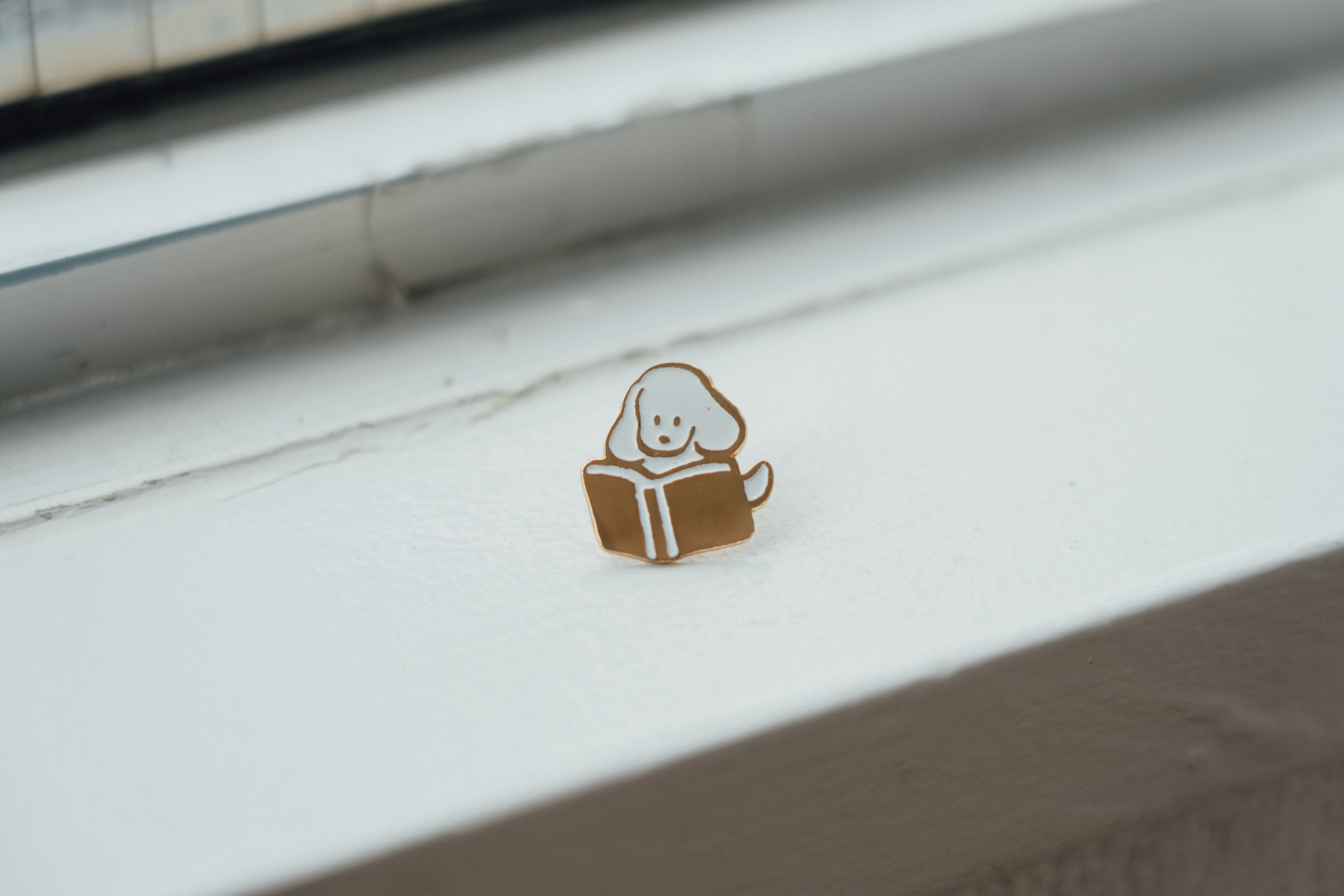 イラストレーターてらおかなつみさんの、犬のピンバッチ(小)本です。布のブックカバーなどにつけたら本を読むのがさらに楽しくなりそう、そんなかわいいピンバッチです。