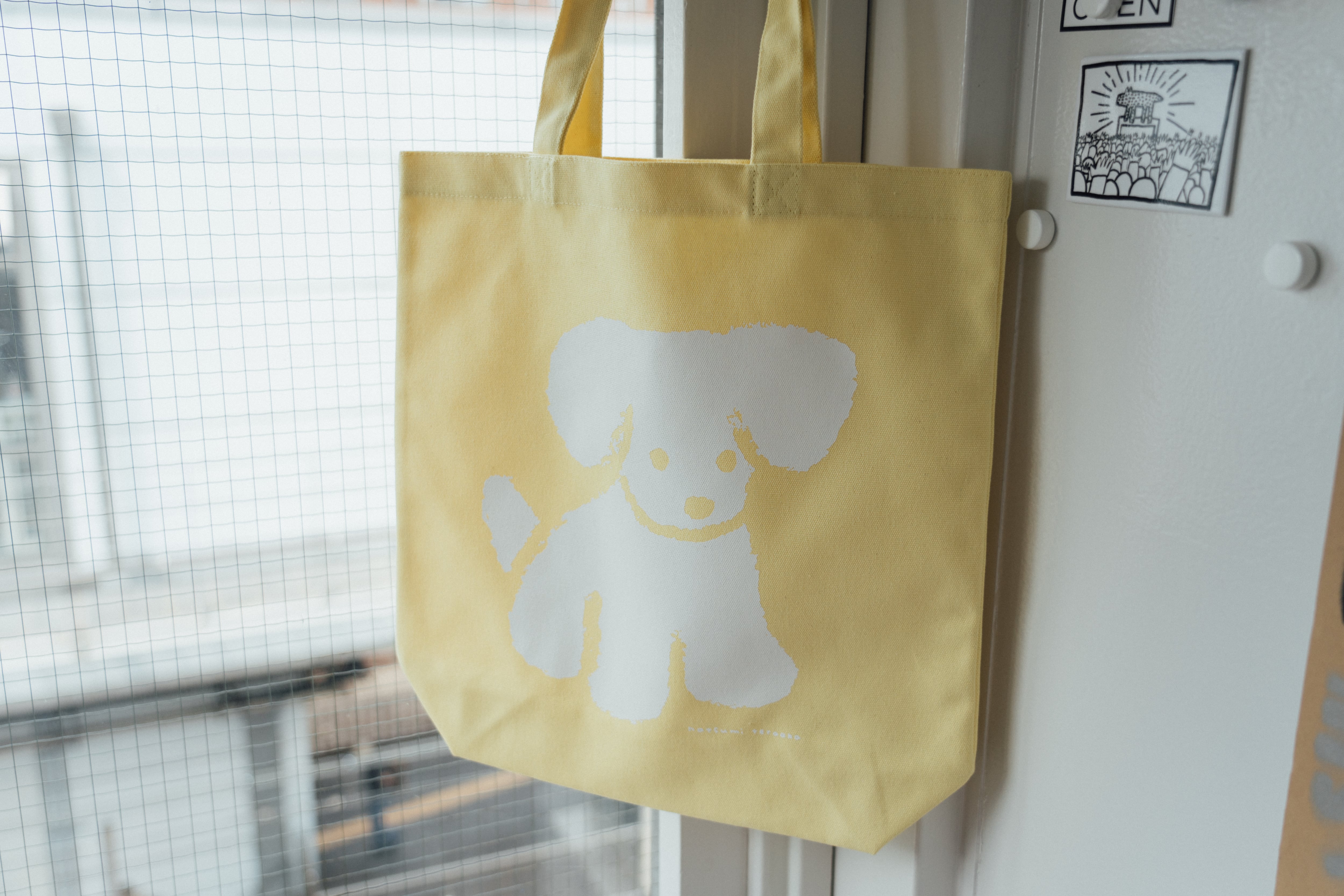 イラストレーターてらおかなつみさんの、犬のトートバッグ(黄色)です。
