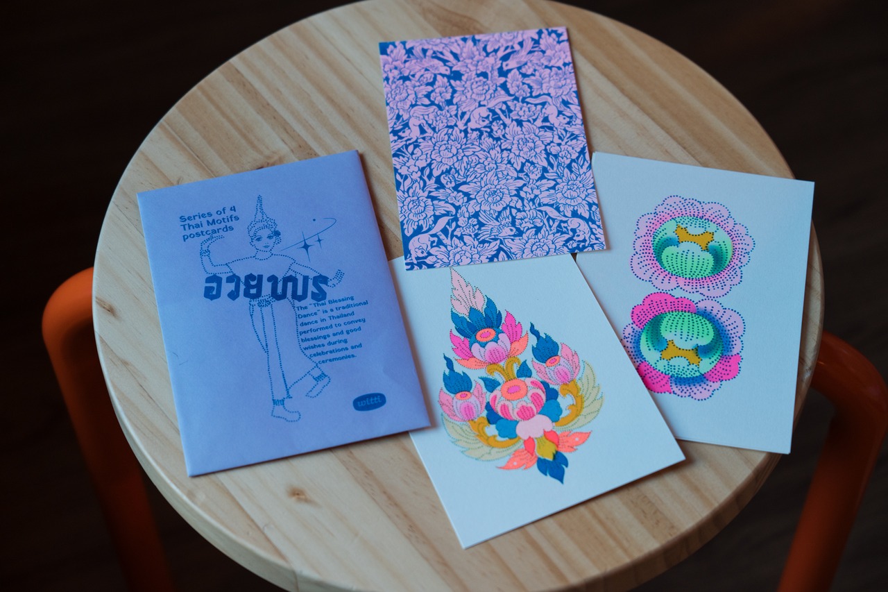 バンコクのリソグラフスタジオwitti studioの作品。花をモチーフにしたリソポストカードが3枚入っています。